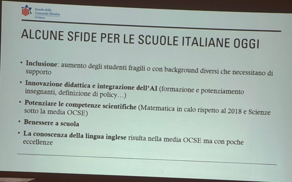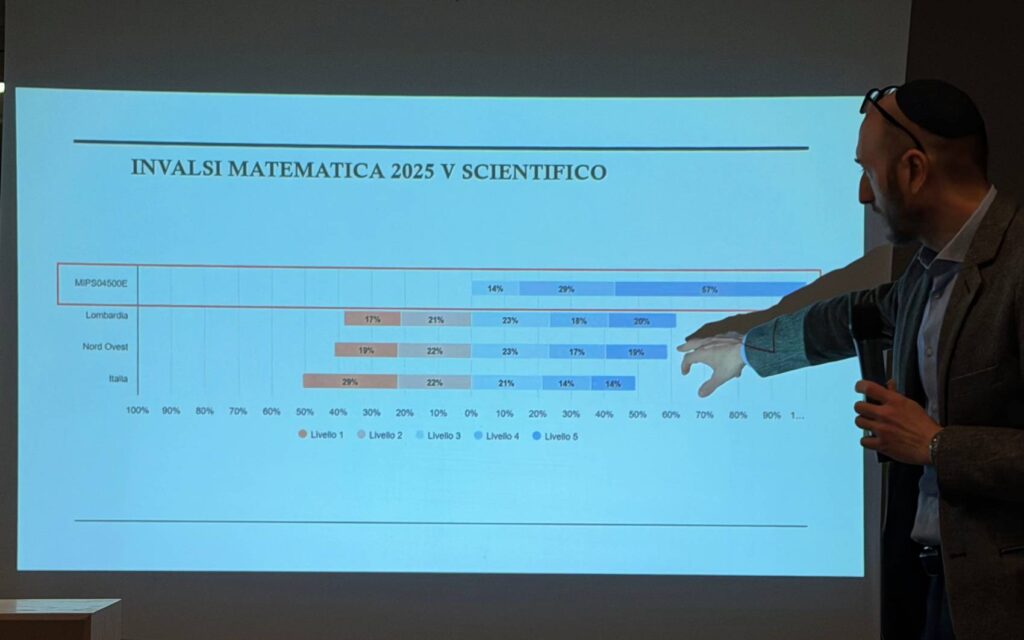 A sostenere il valore del liceo scientifico scienze applicate sono stati i numeri presentati dal professor Zito. Secondo Eduscopio, il liceo della Scuola Ebraica è al primo posto fra gli scientifici scienze applicate di Milano. «I nostri studenti ottengono risultati universitari mediamente superiori a quelli di molti licei storici, anche classici e scientifici tradizionali», ha spiegato, ricordando anche l’alta percentuale di diplomati che proseguono gli studi all’estero o accedono alle università italiane più selettive.