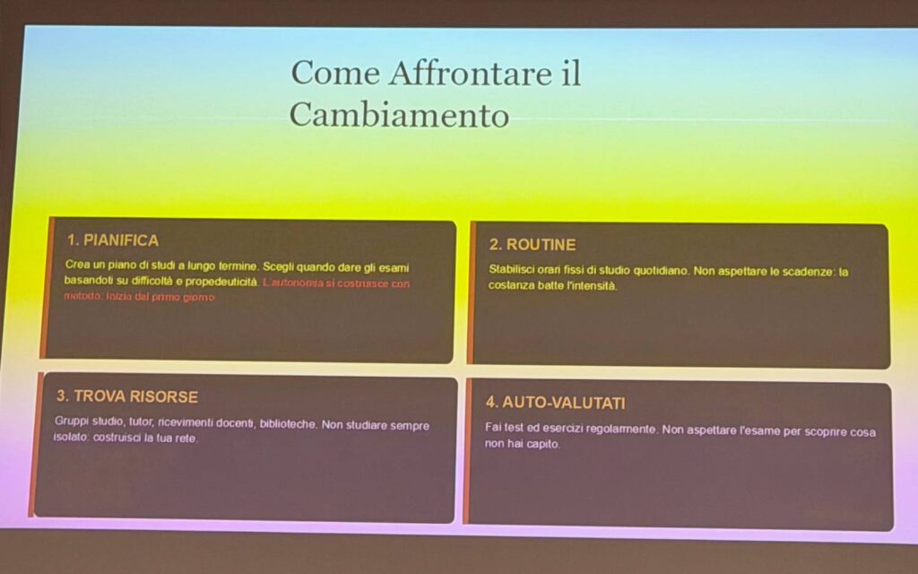 Salmona ha insistito sulla necessità di affrontare il cambiamento con metodo. La libertà universitaria, ha spiegato, può diventare un’opportunità oppure un rischio, soprattutto nei primi mesi. «Andare all’università è divertente, ma bisogna essere capaci di autogestirsi fin dal primo momento» ha osservato, menzionando il rischio di abbandono legato a una cattiva organizzazione iniziale. La strategia passa dalla pianificazione: costruire un piano di studi a lungo termine, decidere quando sostenere gli esami in base alla difficoltà e alle propedeuticità, distribuire il carico di lavoro senza rimandare tutto alle scadenze. La costanza, ha sottolineato, conta più dell’intensità. A questo si affianca l’importanza di non restare soli: creare gruppi di studio, conoscere biblioteche, risorse e compagni con cui confrontarsi diventa parte integrante del percorso. Fondamentale anche l’autovalutazione, attraverso test e verifiche personali, per capire cosa si è compreso davvero e dove invece ci sono lacune da colmare.
