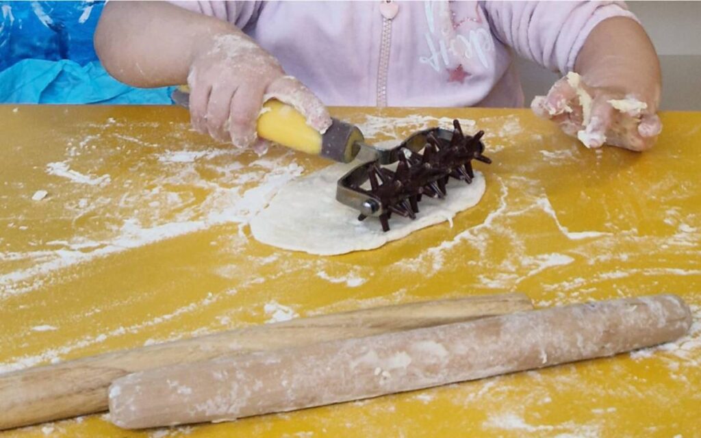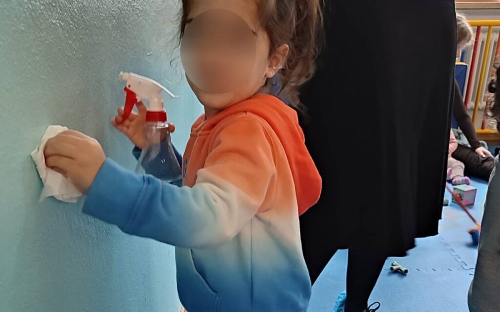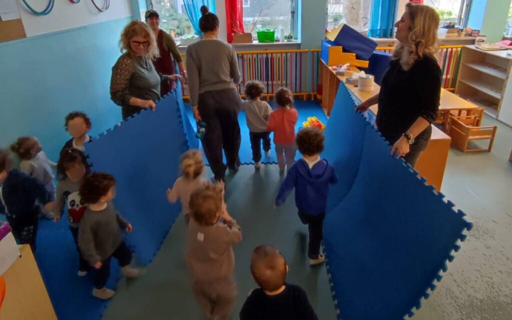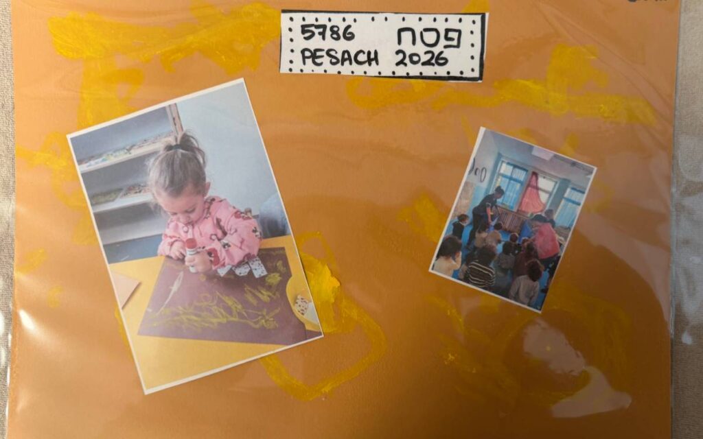Anche al nido il cammino verso Pesach è stato costruito con attenzione, adattando contenuti e linguaggi all’età dei bambini. Il percorso è iniziato con il racconto della primavera, tra fiori, farfalle e canzoni in ebraico, per poi avvicinarsi progressivamente ai temi della festa. I bambini hanno partecipato simbolicamente alle pulizie di Pesach, utilizzando scopine e straccetti, e hanno poi messo in scena l’uscita dall’Egitto attraverso il gioco e il movimento. Hanno attraversato gli spazi trasformati in ambientazioni narrative: dalle piramidi costruite con i mattoni fino al “mare” rappresentato da tappetoni azzurri. In un momento particolarmente coinvolgente, al gesto di Mosè con il bastone, il mare si è aperto e i bambini lo hanno attraversato, rendendo tangibile il racconto. La preparazione al seder è passata anche attraverso attività pratiche: la realizzazione della matzà con la farina, l’apprendimento dei canti e il gioco dell’afikomen. A conclusione del percorso, ogni bambino ha portato a casa una tovaglietta personalizzata, con la propria fotografia durante le attività e l’impronta delle mani nell’atto di spezzare la mazzà. Gli ambienti del nido sono stati infine decorati con i lavori realizzati dai bambini, creando uno spazio accogliente per il Seder a cui hanno partecipato, seduti a tavola, i più grandi.