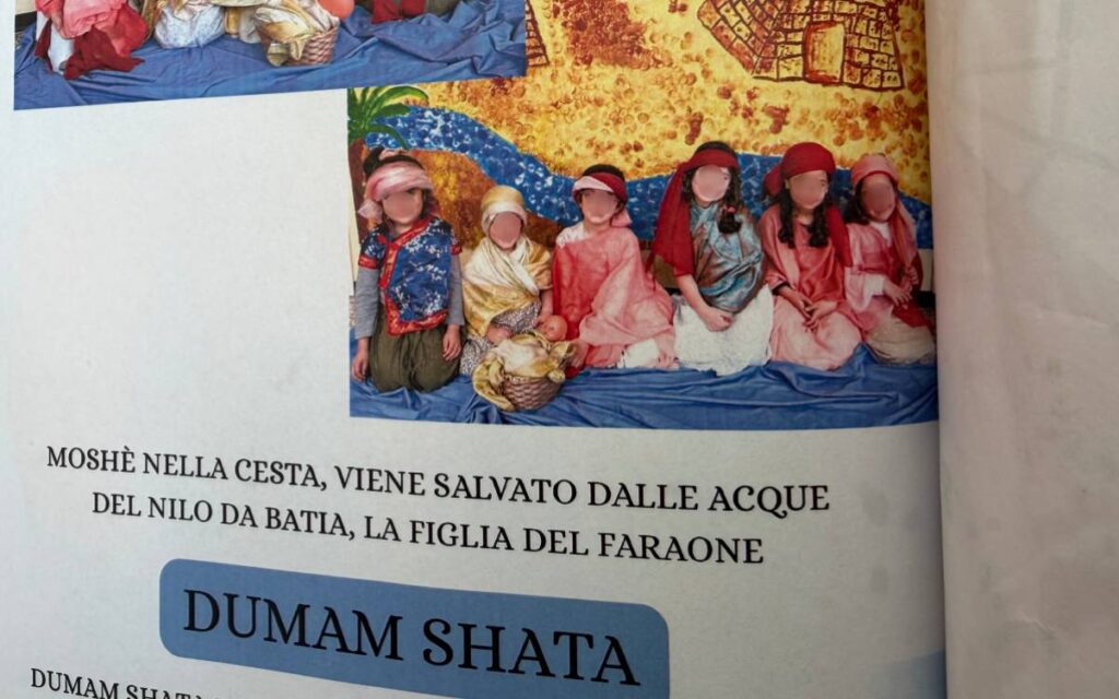 Alla scuola dell’infanzia, il percorso verso Pesach si è sviluppato nel corso di settimane. Tutte le classi hanno lavorato sulla narrazione dell’uscita dall’Egitto, esplorando simboli e significati della festa con modalità espressive differenti: chi ha recitato, chi ha cantato, chi ha raccontato. I bambini hanno disegnato grandi cartelloni illustrati, utilizzando diverse tecniche pittoriche, per rappresentare le tappe principali della storia. Poi le attività diversificate per età. I più piccoli, di tre anni, hanno realizzato tovagliette illustrate con le fasi del seder, arricchite da fotografie che li ritraggono durante le attività. I bambini di quattro anni hanno decorato tovagliette per coprire le matzot, utilizzando tempere e pennarelli da stoffa, inserendo scritte e motivi floreali legati alla primavera. I cinque anni, invece, hanno affrontato un percorso più strutturato: si sono travestiti, hanno messo in scena episodi del Seder e trasformato questa esperienza in una Haggadà fotografica, costruita a partire dalle immagini della loro recitazione. Per tutti un lavoro articolato, frutto di circa un mese di preparazione, che ha trovato compimento nella celebrazione finale del Seder.