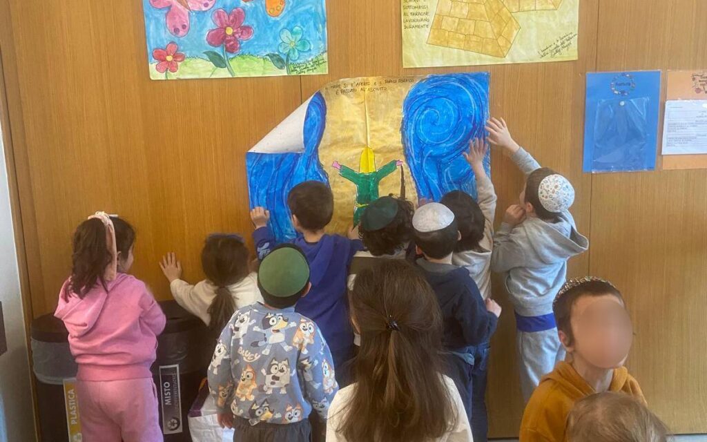 Durante la mattinata, i bambini hanno condiviso con gli anziani i lavori realizzati in classe: cartelloni dedicati a Pesach, ricchi di immagini e colori. Appesi alle pareti della struttura, i disegni sono diventati lo spunto per raccontare la festa, osservandone i simboli e soffermandosi sul loro significato. Insieme, bambini e anziani hanno ripercorso le fasi del Seder, trasformando il racconto in un momento condiviso.