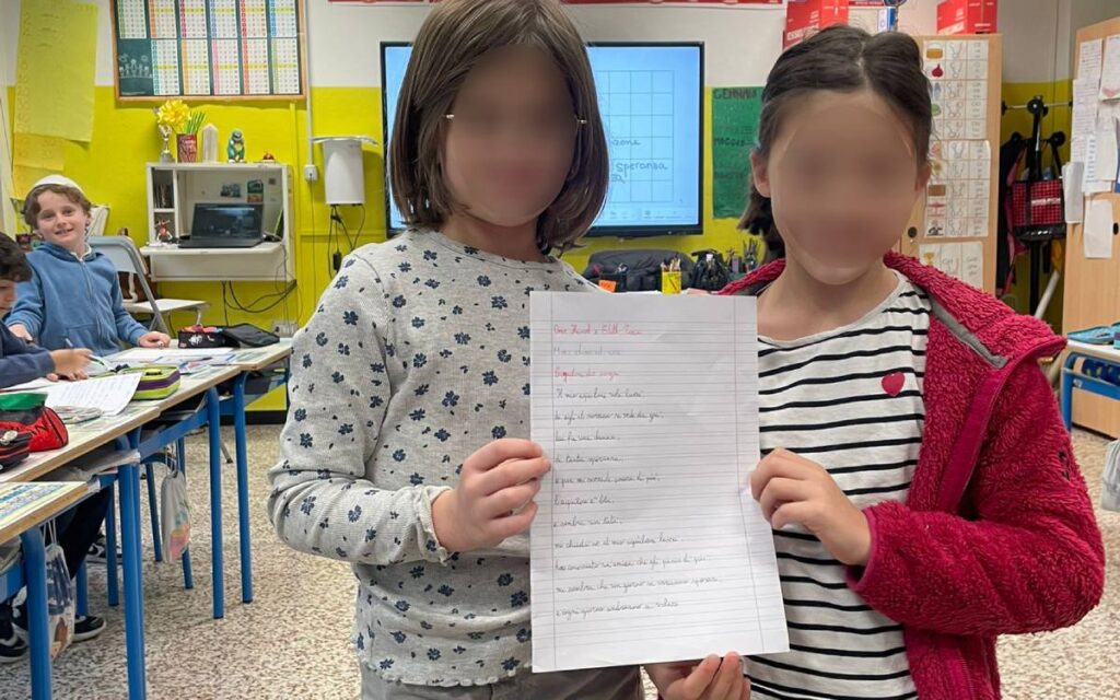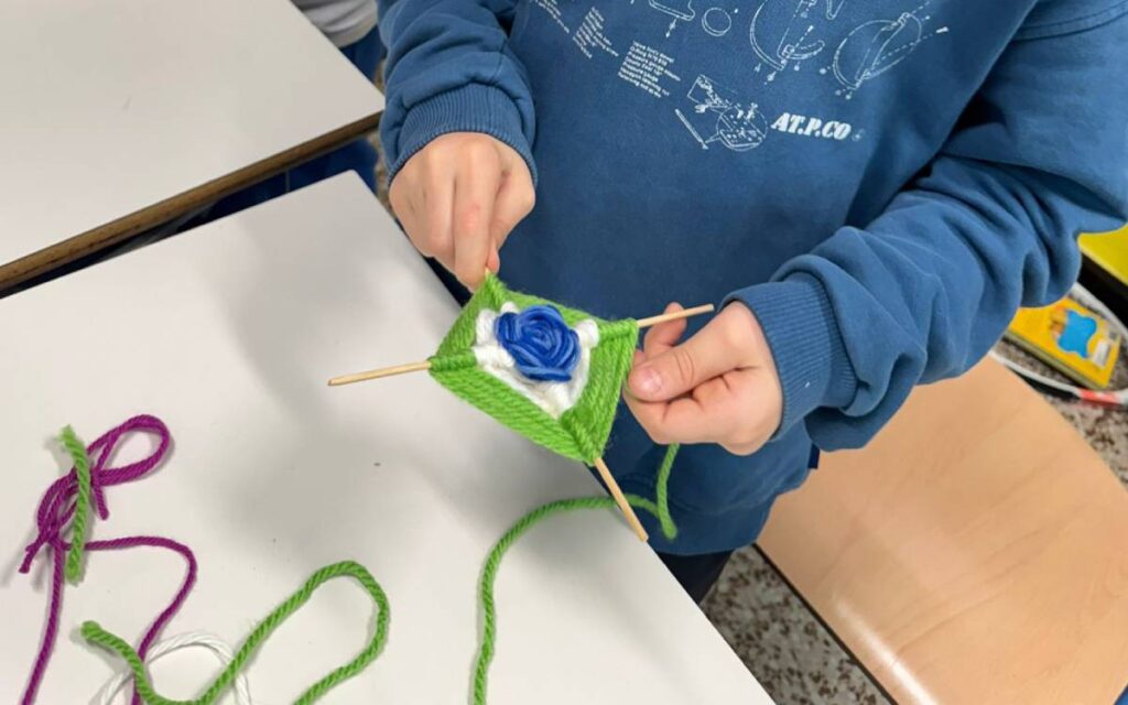 Per le classi terze il percorso ha intrecciato abilità manuali e produzione linguistica. «Abbiamo unito la motricità fine alla scrittura», racconta la morà. «I bambini, in coppia, hanno realizzato piccoli aquiloni con la lana: un lavoro che richiede precisione, capacità di seguire indicazioni, coordinazione. Poi abbiamo collegato tutto all’italiano». Ogni coppia ha composto una filastrocca dedicata all’aquilone e al volo, letta ad alta voce davanti ai compagni. «Mi interessava che il gesto e la parola dialogassero. Costruire con le mani e poi dare forma, attraverso il linguaggio, a ciò che si è creato. È un modo per far capire che le discipline non sono compartimenti stagni».